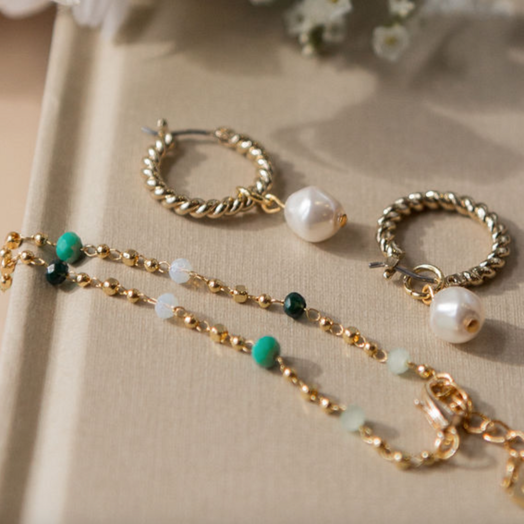 - Couleurs des perles: émeraude, jade, fluorite, opale rose.